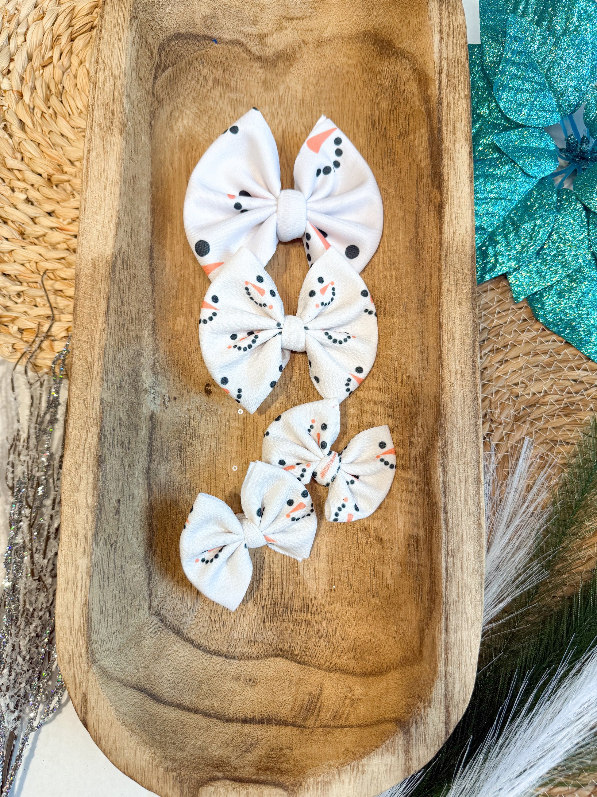 Snowman print. Headwrap & big bows have large scaling and are on light scuba fabric. Remaining styles are scaled smaller and on liverpool fabric!