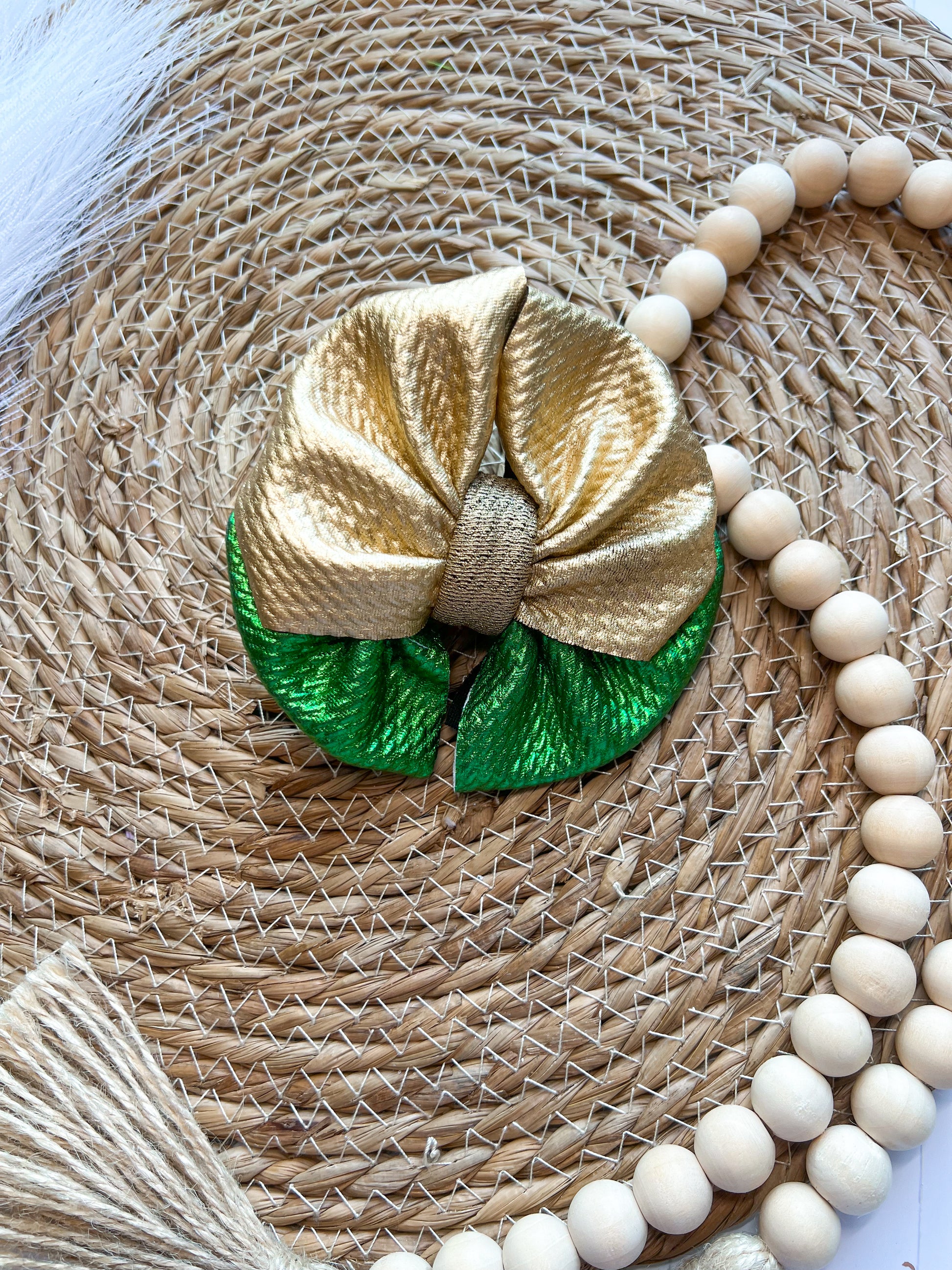 Green and Gold Layered Metallic Pleather Messy Hair Bow