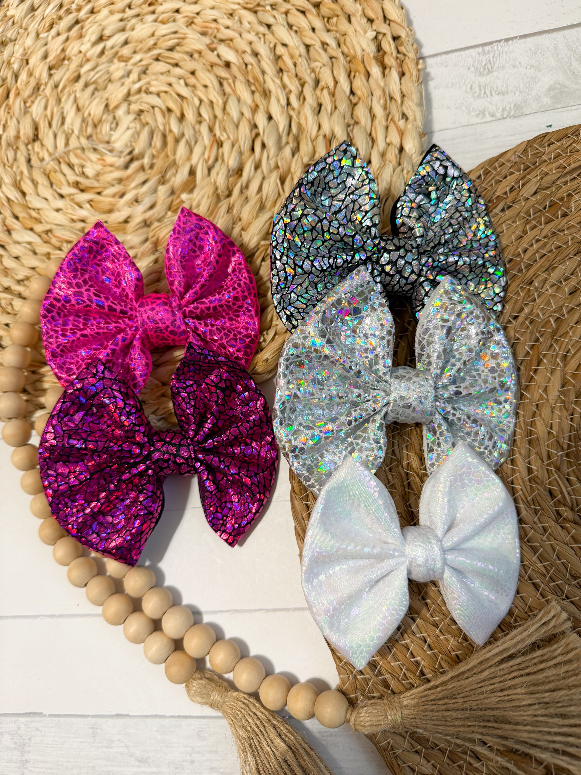 Hot pink, magenta, white, silver, black/silver snake skin hair bows